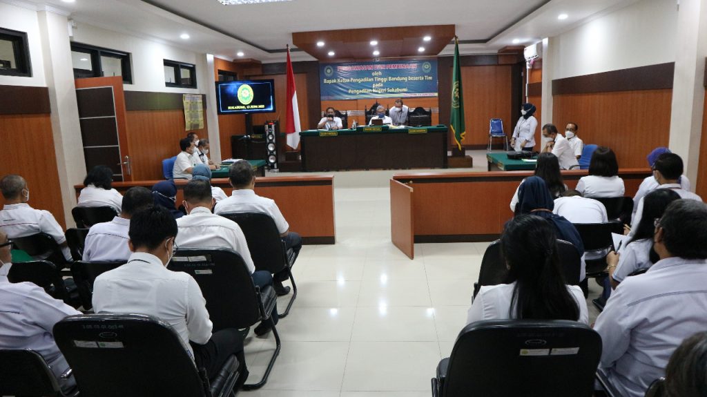 Setelah dilakukan pengawasan, kemudian dengan dipimpin oleh Yang Mulia Dr. H. Herri Swantoro, S.H., M.H. dilakukan pembinaan di ruang sidang utama. Pembinaan dihadiri oleh seluruh aparatur Pengadilan Negeri Sukabumi. Dalam pembinaan dibacakan temuan-temuan tiap bidang oleh Hakim Tinggi Pengawas Daerah.