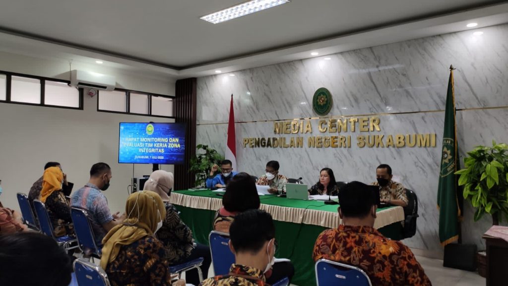 (7 Juli 2022) Setelah melakukan rapat rutin bulanan, kegiatan dilanjut dengan rapat monitoring dan evaluasi (monev) tim kerja Zona Integritas (ZI) bulan Juni 2022. Rapat dipimpin oleh Ibu Wakil Ketua Pengadilan Negeri Sukabumi, Himelda Sidabalok, S.H., M.H., selaku Ketua Tim Kerja ZI. Selain itu dalam rapat dihadiri pula seluruh Koordinator dan Anggota area ZI.